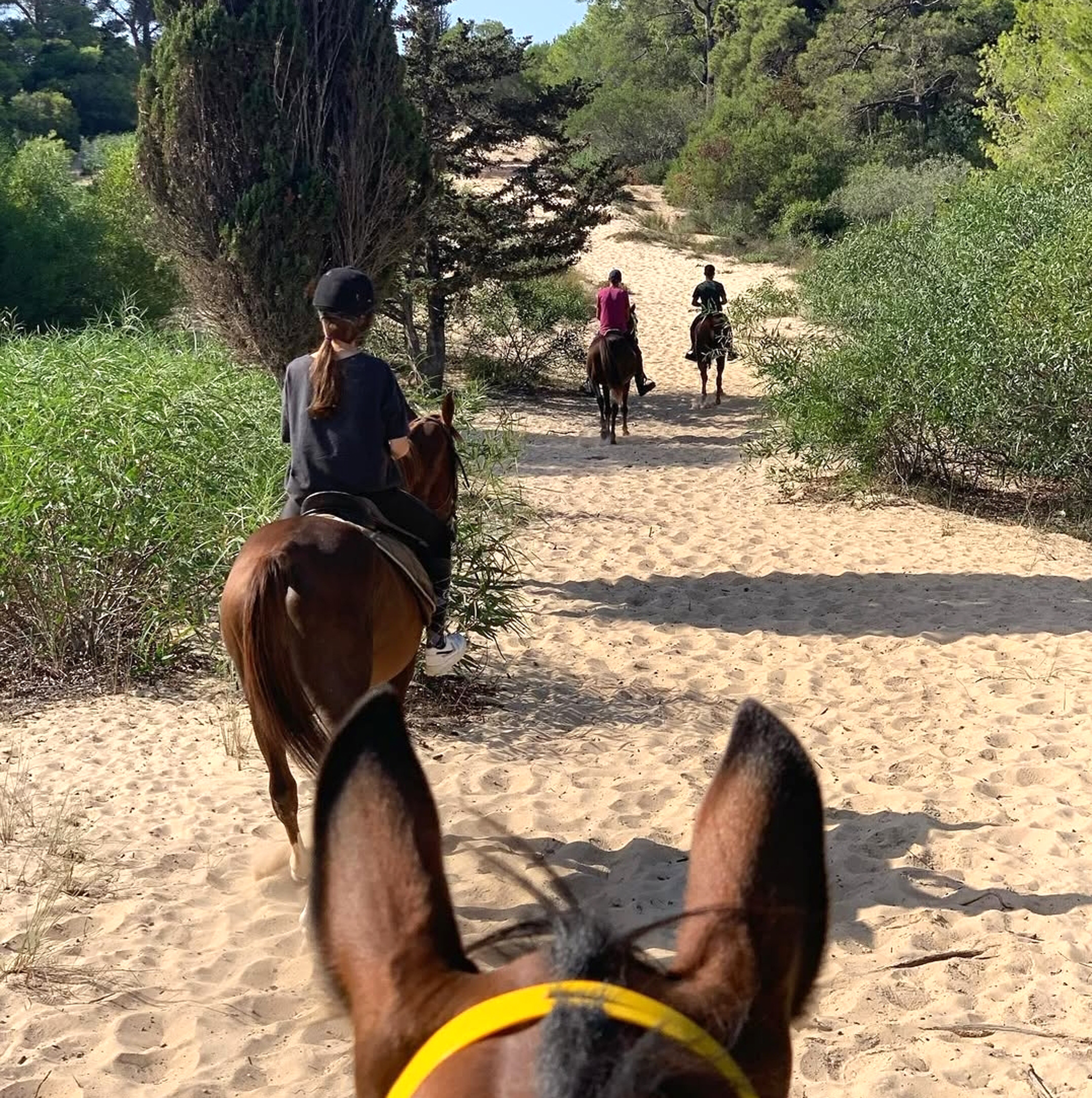 This stretch of coastline is hardly accessible on foot and therefore remains almost untouched. With fine sand, crystal-clear water and no crowds, it feels like a hidden place waiting to be discovered on horseback. Here we can let the horses move freely at a trot and enjoy our first canter along the shoreline, while the waves roll gently beside us.
